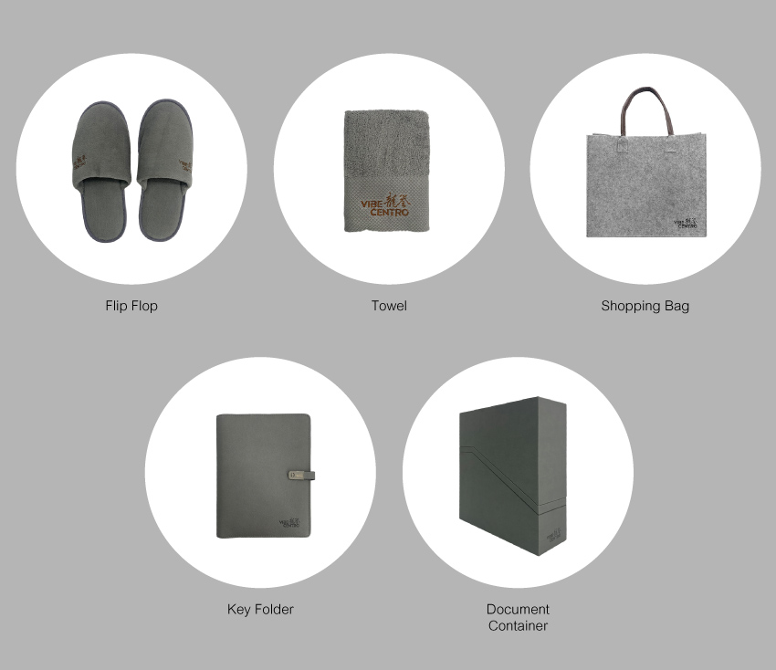 The welcome gift box contains flip flops, towel, a key folder, shopping bag,