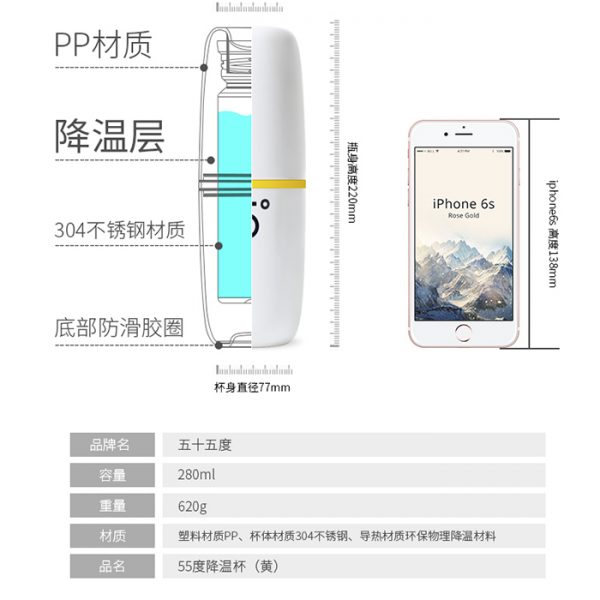 產品名稱:55度杯保溫杯 保持溫度在55度 利用物理降溫及升温: 將100攝氏度的開水倒入杯中,旋緊杯蓋,左右搖晃十多個來回,放置約1分鐘後擰開杯蓋,杯中原本的開水快速降溫至可飲用的溫水,也可保溫約3小時。 當第一杯開水喝完後,(第二杯)也可將涼水倒入杯中,旋緊杯蓋,同樣左右搖晃十多個來回,約1分鐘後再擰開杯蓋,杯中原本的涼水也會快速變成可立刻飲用的溫水 耐用的不銹鋼內部和外部,無異味無異味,健康,口感好。舒適獨特的造型,容易使用.
